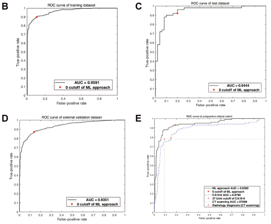 ML辅助代谢型PDAC检测方法在验证研究训练数据集&内部验证数据集&外部验证数据集&前瞻性临床队列中的ROC曲线(图源:Science Advances)