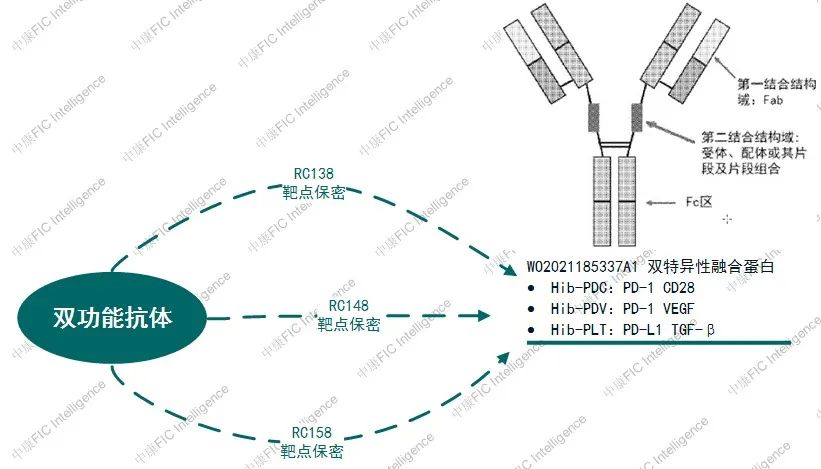 荣昌生物的双功能抗体平台称为“Hibody”,据称其具有更优越的蛋白表达,更容易实现CMC生产。目前,已公布的管线中RC138、RC148和RC158为双抗产品,但相关作用靶点均未公开。由于双抗的产品信息披露较少,在专利方面公开信息亦不多,目前仅有一个与双抗相关的PCT申请。从该PCT申请(WO2021185337A1)的权利要求看,该申请更多旨在保护双抗平台,列举了大量不同靶点的组合。但由于其实施例仅为图3所示的三种方案:(1)Hib-PDC:第一结构域靶向PD-1+第二结构域靶向CD28,(2)Hib-PDV:第一结构域靶向PD-1+第二结构域靶向VEGF,(3)Hib-PLT:第一结构域靶向PD-L1+第二结构域靶向TGF-β。因此,目前该案权利要求可能在将来审查程序中将面对不小的挑战。