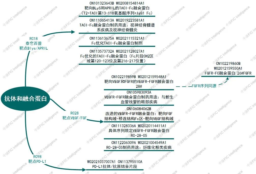如图1所示,荣昌生物在基础专利(CN102219859B)保护VEGF/FGF双靶点融合蛋白28#(即对应于RC28),该专利中保护了VEGF 受体1、VEGF 受体2 和FGF 受体1 的胞外结构域与人IgG1组成的融合蛋白。而康柏西普在其基础专利保护了由VEGF受体1 和VEGF 受体2 的胞外结构域与人IgG1 组成的融合蛋白。因此, RC28在靶点、分子结构、作用机理方面均是不同康柏西普的。
