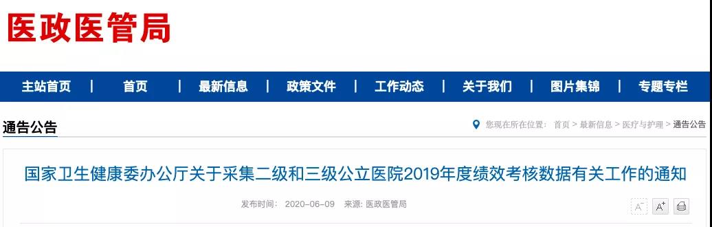今日(6月9日),国家卫健委发布《关于采集二级和三级公立医院2019年度绩效考核数据有关工作的通知》。根据通知,各三级公立医院应当于2020年6月12日-6月19日,登录公立医院绩效考核管理平台上报数据。各省级卫生健康委应当于2020年6月26日前完成三级公立医院填报数据的在线审核工作,确保医院上报数据的真实性、完整性。参加2019年度绩效考核的二级公立医院应当于2020年7月20日-8月5日,登录管理平台上报数据。各省级卫生健康委应当于2020年9月6日前完成二级公立医院填报数据的在线审核工作,确保医院上报数据的真实性、完整性。 除特殊说明外,定量指标中各年度数据均填报当年1月1日至12月31日的数据。通知明确,严禁编造、谎报、瞒报数据等情况。国家卫健委将会同有关部门,组织专家对数据进行复核、分析,对于考核过程中存在故意编造、谎报、瞒报数据和其他违规违纪行为的单位和个人,予以严肃处理。