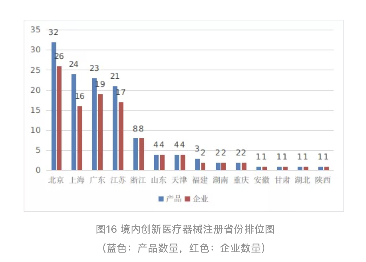 北京、上海、广东、江苏、浙江创新医疗器械获批产品数量和相应企业数量最多,约占全部已批准的134个创新医疗器械的81%。