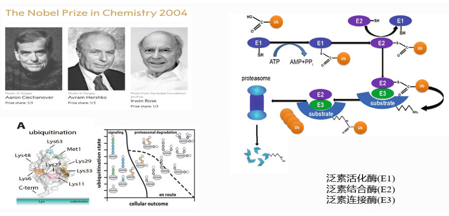 2004年的诺贝尔化学奖授予了发现泛素调节的蛋白降解途径的三位科学家,这是一种泛素-蛋白酶体系统(UPS)参与的蛋白降解途径。首先通过消耗1分子ATP激活泛素小分子,使它与一种泛素激活酶E1形成复合物,随后这个泛素分子又转移到了泛素结合酶E2上形成复合物,当泛素连接酶E3识别结合底物蛋白时,这个复合物会紧接着和它结合,泛素就会直接或者间接地从E2转移到底物蛋白上。