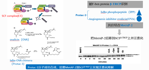 2001年,耶鲁大学的Craig Crews教授与加州理工学院的Ray Deshaies教授联手发表了一篇具有里程碑意义的论文,他们利用含SCFβ-TRCP的E3诱导了MetAp-2的降解,首次引入了靶向嵌合蛋白水解(PROTAC)一词,他们将他们设计的PROTAC分子命名为PROTAC-1,它的一端是E3连接酶的配体,IκBα 磷酸肽,另一端是靶蛋白MetAP-2配体,血管生成抑制剂ovalicin,利用这把“双向抓手”,把靶蛋白MetAP-2招募到SCFβ-TRCP上,实现泛素化和蛋白酶体降解。