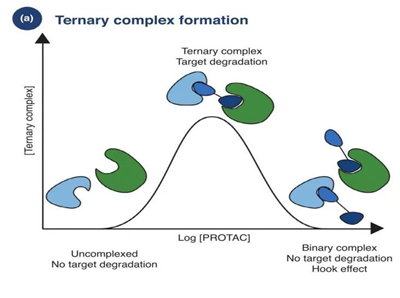 PROTAC的元件及其品质初步达标后,接下来要考虑的问题是,打造多少支医药丘比特之箭恰到好处?由于三元复合物往往呈现钟形动力学曲线,所以PROTAC与有效复合物并不呈现简单的正相关关系。