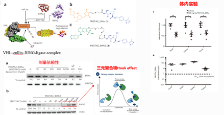 2015年这个团队发表了一项重要研究,他们设计了两种基于VHL E3 ligase的小分子PROTAC,一种带有雌激素相关受体(ERRα)的配体,另一种是RIPK1蛋白激酶的配体,中间通过linker与高亲和性的VHL配体连接,靶蛋白的水平与癌症、自身免疫性疾病发病有关的。
