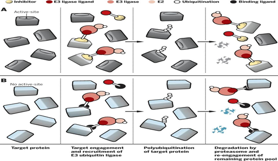 这种人工诱导的蛋白降解最早报道是在1995年,研究者设计出了一系列可以与IgG结合嵌合的E2结合酶,他们的创新思路是把一个蛋白结合域附加到E2结合酶的C端,从而形成一个含有靶蛋白结合域的E2嵌合体,这个嵌合体就会基于自身的性质去特异性识别并且泛素化相应的靶蛋白。