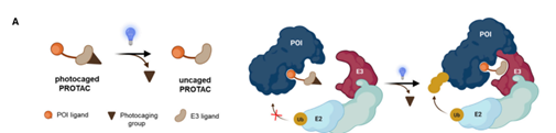 前者是在PROTAC的配体上添加“光笼基团”以钝化正常状态下的PROTAC,经特定波长光照射后“光笼基团”脱落,实现不可逆的PROTAC启动。