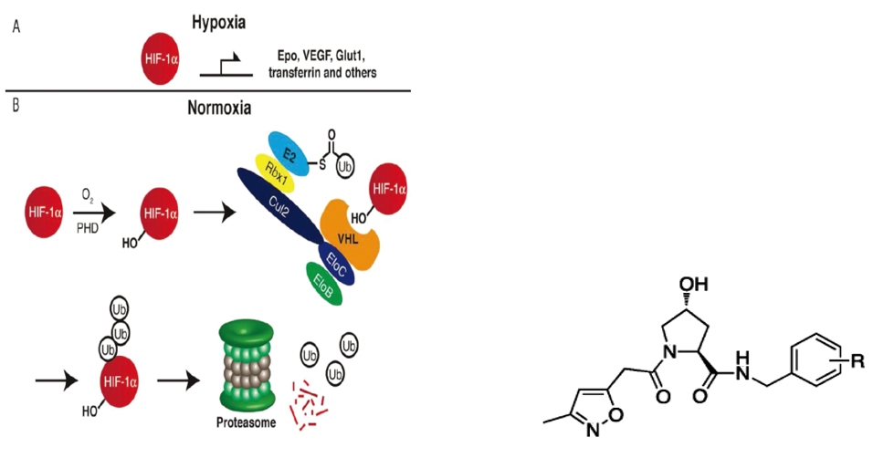 2012年,VHL的高亲和力拟肽配体被发现,HIF-1α(缺氧诱导因子)是一种转录因子,在缺氧条件下被激活,上调促红细胞生成素,血管内皮生长因子,葡萄糖转运蛋白,转铁蛋白等的表达。它可以与E3连接酶中的VHL相互作用,被泛素化并进入蛋白酶体降解途径。对这条降解途径的抑制可以有效替代慢性贫血等由于缺乏HIF-1α引起的疾病治疗药物。