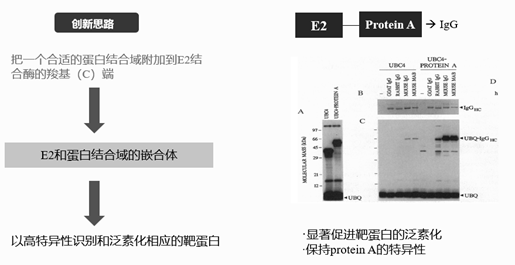 他们选择了一种E2结合酶(UBC4)和protein A嵌合,protein A可以特异性识别多种IgG抗体。这种构造的E2嵌合体具有很好的原始E2的活性,可以结合泛素。它能够显著促进靶蛋白IgG的泛素化,这种E2嵌合体的特异性与protein A一致,由于proteinA能够识别鼠和兔的IgG而不识别山羊的IgG,因此该嵌合体也能够识别鼠和兔的IgG而不识别山羊的IgG。而且这些人工诱导的泛素化特征是可以被蛋白酶体识别降解的。这项基于E2嵌合体的创新研究,首次实现人工诱导蛋白降解,为PROTAC技术奠定了基础。