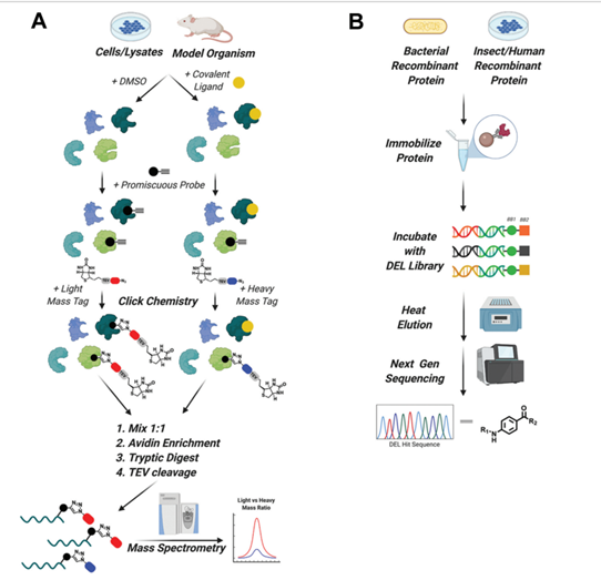 图11. 两种高效筛选配体的方法工作示意图。左图为chemo proteomic competition,右图为DNA encoded library。图片来源:Bond, Michael J, and Craig M Crews. “Proteolysis targeting chimeras (PROTACs) come of age: entering the third decade of targeted protein degradation.” RSC chemical biology vol. 2,3 725-742. 19 Mar. 2021, doi:10.1039/d1cb00011j