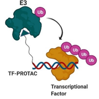 图10. 靶向转录因子的PROTAC工作示意图,蓝红螺旋即为核酸分子,与转录因子直接结合从而拉近E3与POI,图片来源:Hu, Zhenyi, and Craig M Crews. “Recent Developments in PROTAC-Mediated Protein Degradation: From Bench to Clinic.” Chembiochem : a European journal of chemical biology, 10.1002/cbic.202100270. 8 Sep. 2021, doi:10.1002/cbic.202100270