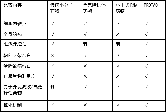 表1. PROTAC药物与其他几种药物的特征对比