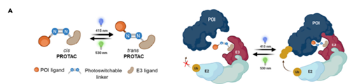 后者则是在PROTAC的linker中引入偶氮苯基团,切换不同波长的光会改变linker的顺反构型,而只有一种构型有利于三元复合物形成,这样便形成可逆PROTAC开关。