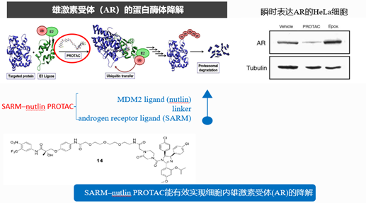 带着这些问题,他们选择了与前列腺癌相关的雄激素受体(AR)和与乳腺癌相关的雌激素受体(ER)作为降解的目标蛋白。很有意思是,这两个靶蛋白成为了后来Arvinas公司也是目前全球推进最快的PROTAC降解的蛋白。这两张图就是将AR和ER泛素化的示意图。
