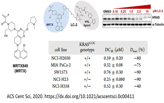 虽然KRAS的不可成药性被小分子抑制剂终结了,但是降解剂在该靶点仍然大有可为。针对KRAS-G12C突变,Crews等人在KRAS抑制剂AMG510和MRTX849的基础上,设计并合成了相关的PROTAC,活性测定发现了具有良好降解活性的降解剂,这或许可以为进一步攻克RAS提供新的解决方案。