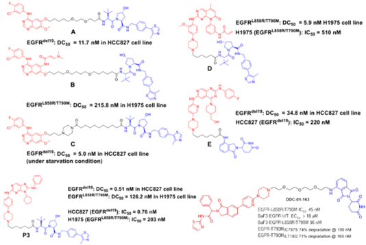图18. EGFR-PROTACs. [1] Cell Chem Biol 2018, 25, 67-77. [2] J Med Chem 2020, 63, 1216-1232. [3] Eur J Med Chem 2020, 189, 112061. [4] Eur J Med Chem 2020, 208, 112781. [5] Eur J Med Chem 2020, 192, 112199. [6] Angew Chem Int Ed 2020, 59, 14481.