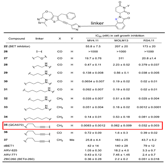 PROTAC技术第三个优点是不仅可以实现小分子抑制剂难以做到的选择性,在提高活性方面也具有非常显著的优势。以PROTAC技术应用最早的靶点BET(BRD2/3/4)为例,秦冲等人发现的QCA570在细胞抗增殖活性方面表现出了明显优于JQ1等抑制剂的能力,JQ1等抑制剂的活性大都在纳摩尔级水平,而QCA570的活性提高了三个数量级,达到了惊人的皮摩尔级水平。基于出色的体外细胞抗增殖活性,降解剂在体内也表现出了强效抗肿瘤活性,而且呈现出给药剂量低和给药频次也低的特点。这说明在类似BET等靶点中,PROTAC具有明显的优势。