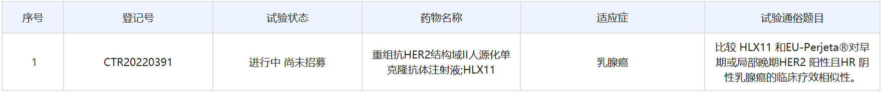 公开资料显示,HLX11为复宏汉霖以原研为参照药、按照中国《生物类似药研发与评价技术指导原则(试行)》开发的帕妥珠单抗生物类似药,其潜在适应症主要包括联合曲妥珠单抗和化疗用于HER2阳性早期乳腺癌的新辅助治疗和辅助治疗,以及联合曲妥珠单抗和多西他赛治疗HER2阳性转移性或不可切除的局部复发性乳腺癌患者。
