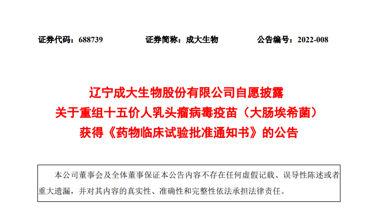2022年3月15日,成大生物发布公告称,公司合作开发的重组十五价人乳头瘤病毒疫苗(大肠埃希菌)收到NMPA核准签发的《药物临床试验批准通知书》,批准重组十五价人乳头瘤病毒疫苗(大肠埃希菌)开展临床试验。