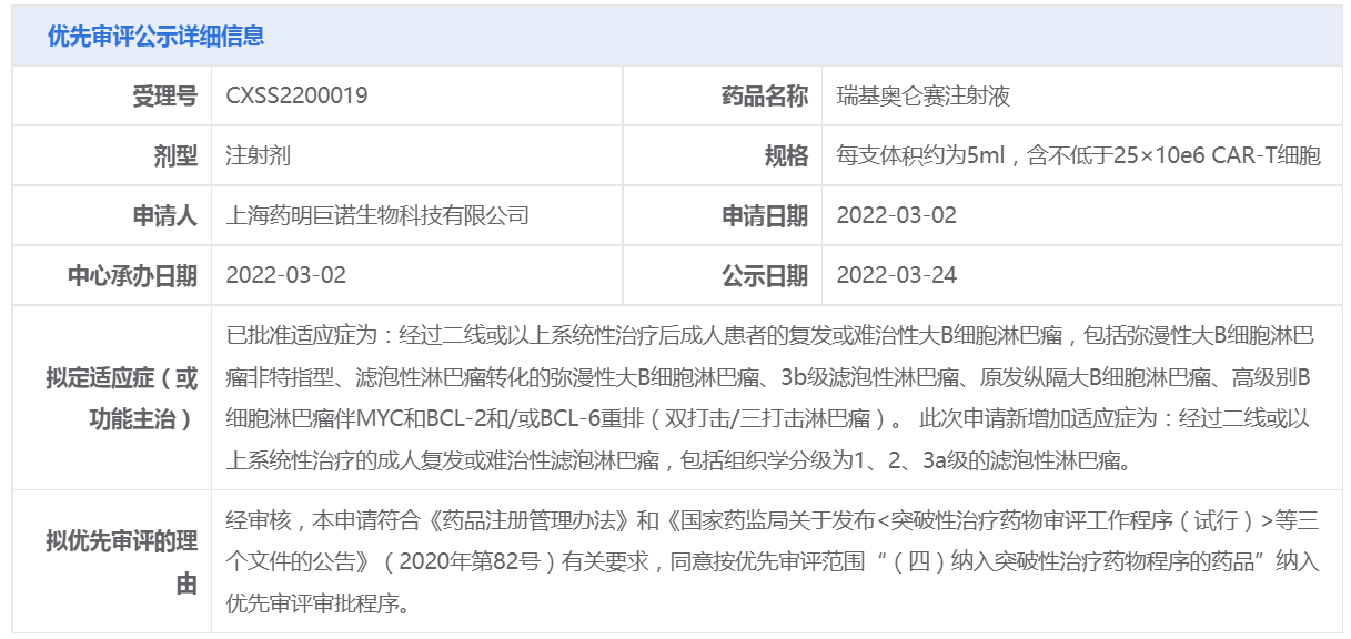 3月24日,CDE官网最新显示,药明巨诺CAR-T疗法瑞基奥仑赛注射液新适应症拟纳入优先审评。此次申请新增加适应症为:经过二线或以上系统性治疗的成人复发或难治性滤泡淋巴瘤,包括组织学分级为1、2、3a级的滤泡性淋巴瘤。