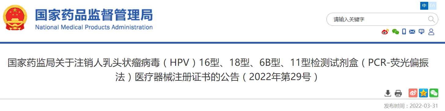 国家药监局关于注销人乳头状瘤病毒(HPV)16型、18型、6B型、11型检测试剂盒(PCR-荧光偏振法)医疗器械注册证书的公告(2022年第29号)