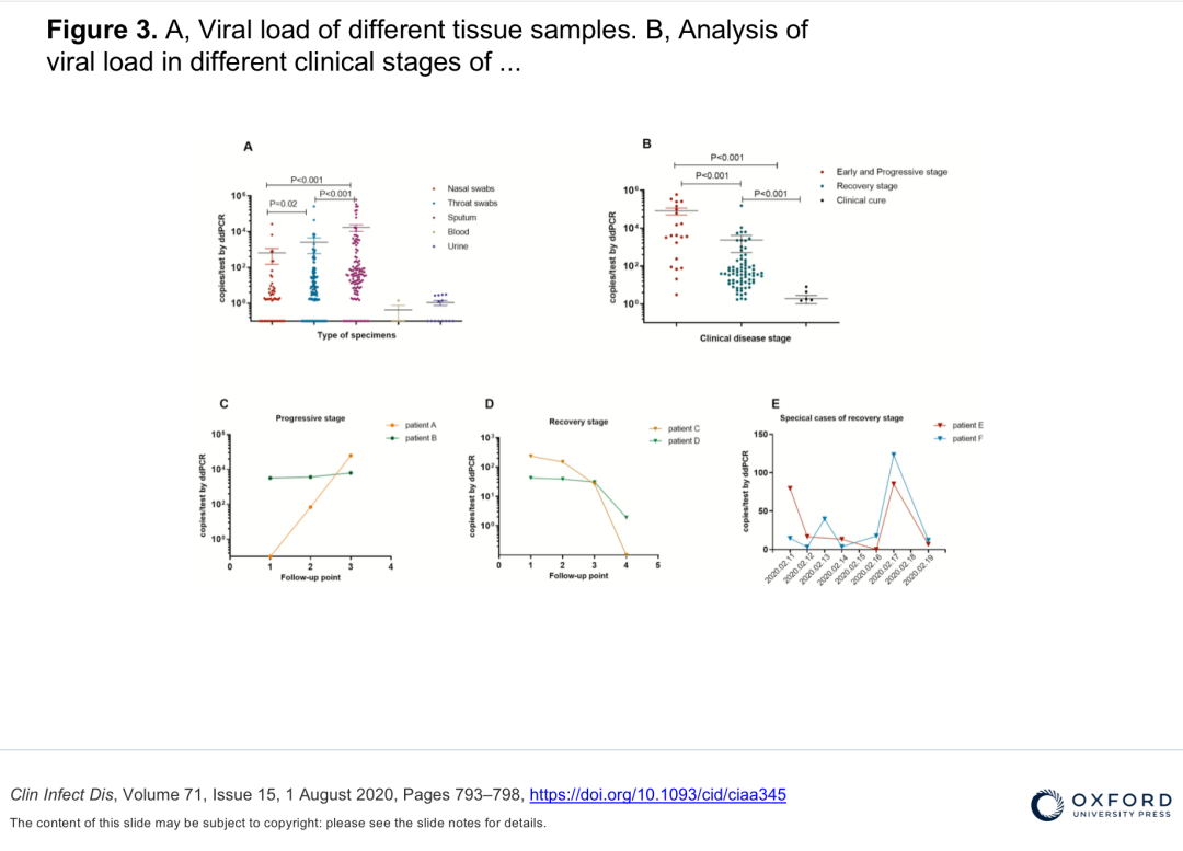 ddPCR 显示:早期和进展阶段的病毒载量显着高于恢复阶段,图源已在图中标注