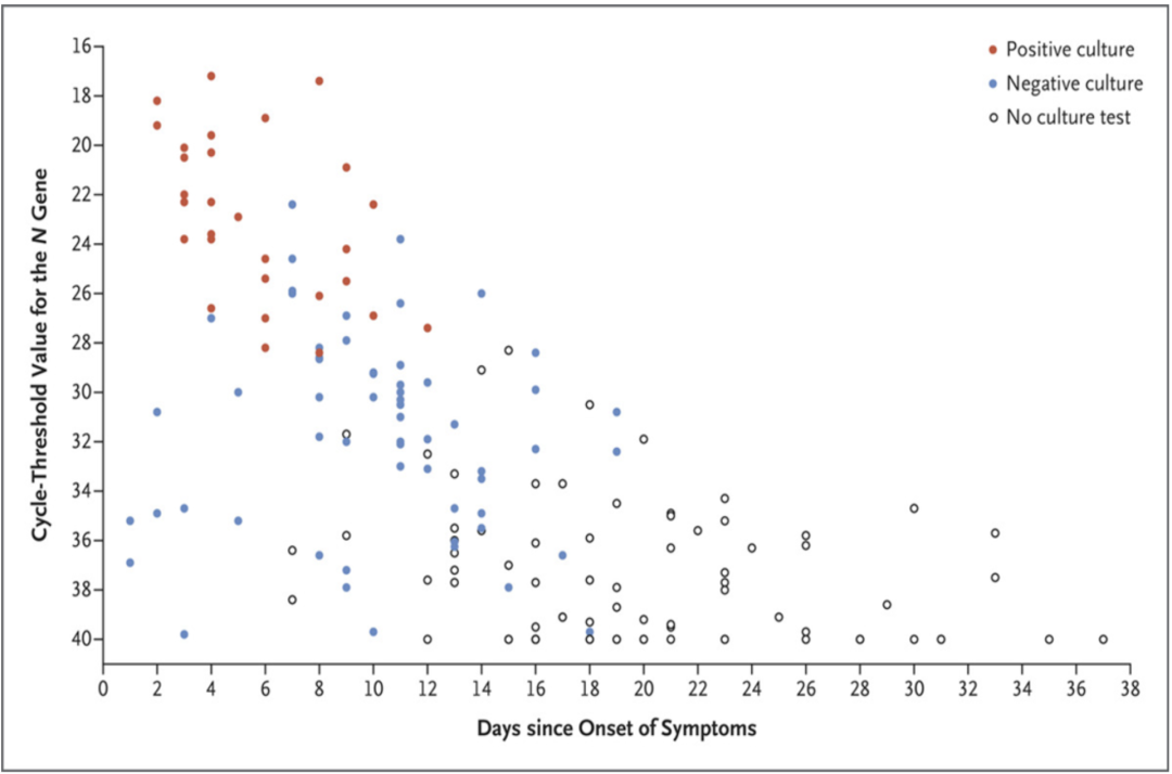 NEJM 之前发布的一项研究显示,新冠脱落病毒失活的时间远短于核酸转阴所需时间。排出活病毒的最长时间为 12 天,而发病到核酸检测转阴的中位时间则远远更长,为 34 天(95% 置信区间最少 24 天)。