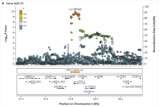 新冠病毒对不同的人影响不同[2],大多数患者仅表现出轻微的症状或者根本没有症状[3];对少数发展成重症的患者,间质性肺炎和急性呼吸窘迫综合征导致的严重呼吸衰竭则是致命的[4],需要通过呼吸机来支持对氧气的需求,也就是所谓的机械通气。 为什么会有这样的区别?什么样的患者会更容易发展成呼吸衰竭呢? 为了搞清楚这个问题,科学家们在疫情严重的意大利和西班牙招募了患者,以期通过GWAS寻找与新冠患者呼吸衰竭有关的风险基因。 研究中纳入了来自七所医院的1980例通过核酸检测确诊的呼吸衰竭新冠患者。这里对呼吸衰竭的定义是吸氧或机械通气,并根据仅吸氧、无创通气、有创通气以及ECMO四种呼吸支持手段来区分严重程度。 经过初步筛选数据可用的参与者基线状况 作为对照,研究者还纳入了另外2381名参与者,他们全都没有表现出症状或仅有轻症,其中有40人存在新冠病毒抗体。空白组则是一些来自既往研究的参与者基因数据或是未知新冠感染状态的参与者。 分析中,两个基因座脱颖而出。 在3p21.31处的rs11385942插入缺失、9q34.2处的rs657152点突变与新冠病毒引起的呼吸衰竭显著相关。而且无论是对所有数据的合并分析,还是分别对意大利和西班牙参与者数据单独分析,这种关联性都是存在的。 两个基因座具有强关联性 那么这两个基因座都有些什么功能呢? 首先来看3p21.31,这个基因座的关联信号包括6个基因,SLC6A20、LZTFL1、CCR9、FYCO1、CXCR6和XCR1。rs11385942等位基因与CXCR6表达降低、SLC6A20表达增加、LZTFL1肺部表达猛增有关。在接受机械通气的患者中,这个等位基因的频率要比吸氧的患者更高。 从这几个基因中,我们能够发现一些与新冠病毒感染相关的功能。SLC6A20编码的是一种转运蛋白SIT1,它是能够与新冠病毒的结合靶点ACE2产生相互作用的[5];而CCR9和CXCR6都编码趋化因子受体,与免疫反应调节和对呼吸道病原体的持续免疫反应有关[6]。 rs11385942的关联信号 再看9q34.2,它关联的信号与ABO血型基因座是一致的。这也就意味着,在所有呼吸衰竭的患者中,ABO血型的分布并不是均衡的。 rs657152与ABO有关 矫正了年龄和性别可能带来的影响之后,研究者发现A型血患者呼吸衰竭的风险显著高于其他患者,风险升高45%,而O型血似乎存在对新冠的保护作用,患者呼吸衰竭的风险比其他血型低35%。对意大利和西班牙两组患者单独分析,这样的关联也是成立的。 此外,在吸氧患者中和机械通气患者中,血型的分布是没有显著差异的。之前,两项发布在预印本平台medRxiv上的研究认为,血型与新冠感染风险有关,A型血感染风险更高,O型血感染风险更低[7,8]。可见,ABO和新冠背后还有更多的生物学机制可供探索。 不过研究者也承认,为了快速招募参与者,这项研究对临床数据的要求是比较宽松的,所以对基因型和表型之间的描述可能存在偏差,对不同人种也没有进行进一步分层,进一步研究是有必要的。