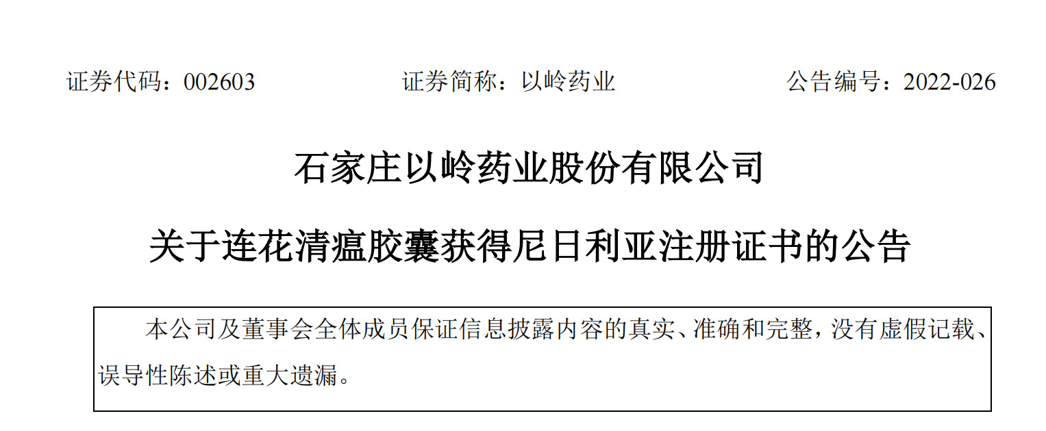 5月10日,以岭药业发布公告称,于近日收到由尼日利亚国家食品药品管理局核准签发的药品注册证书,批准公司药品连花清瘟胶囊在尼日利亚国家食品药品管理局注册,注册号为A7-100340L,到期日期为2024年4月27日。