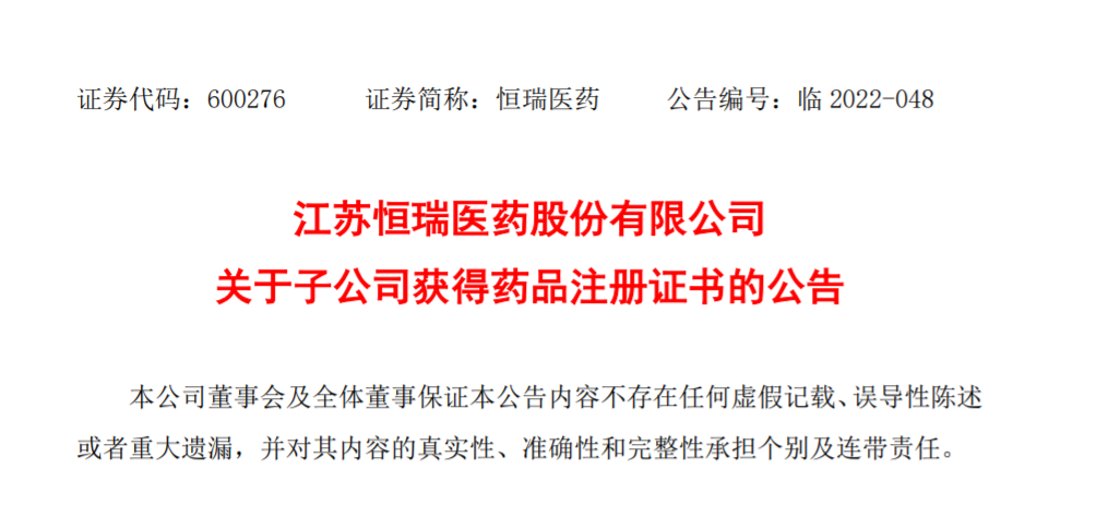 5月10日,恒瑞医药发布公告称,其子公司成都盛迪医药有限公司ω-3 脂肪酸乙酯90软胶囊于近日收到国家药监局核准签发的《药品注册证书》。