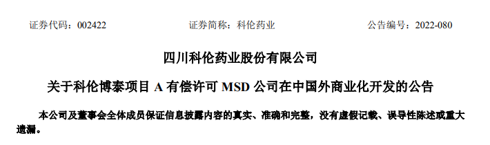 5月16日,科伦药业发布公告,其子公司科伦博泰,于2022年5月13日与MSD签署许可协议修正案,将其具有自主知识产权的生物大分子肿瘤项目A,有偿独家许可给默沙东(MSD)进行中国以外区域范围内的商业化开发。