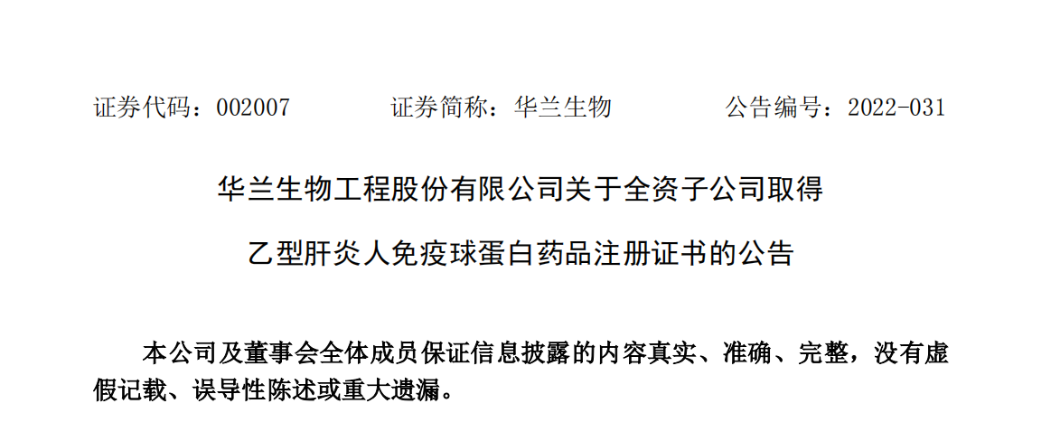 5月23日,华兰生物发布公告称,公司全资子公司华兰生物工程重庆有限公司取得乙型肝炎人免疫球蛋白的药品注册证书,重庆公司研发的乙型肝炎人免疫球蛋白可正式生产和销售,将对公司2022年度经营业绩产生积极影响。