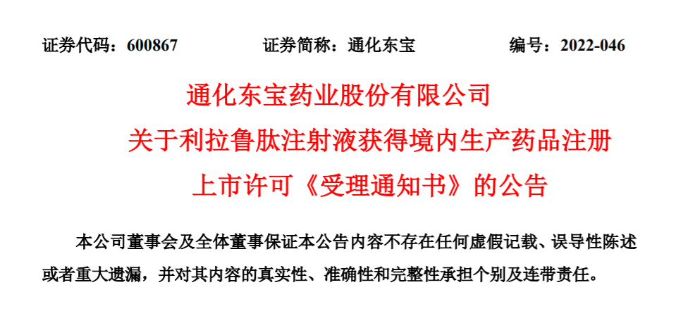 6月8日,通化东宝发布公告称,于近日收到国家药监局下发的关于利拉鲁肽注射液上市许可注册申请的受理通知书,受理号为: CXSS2200058国。
