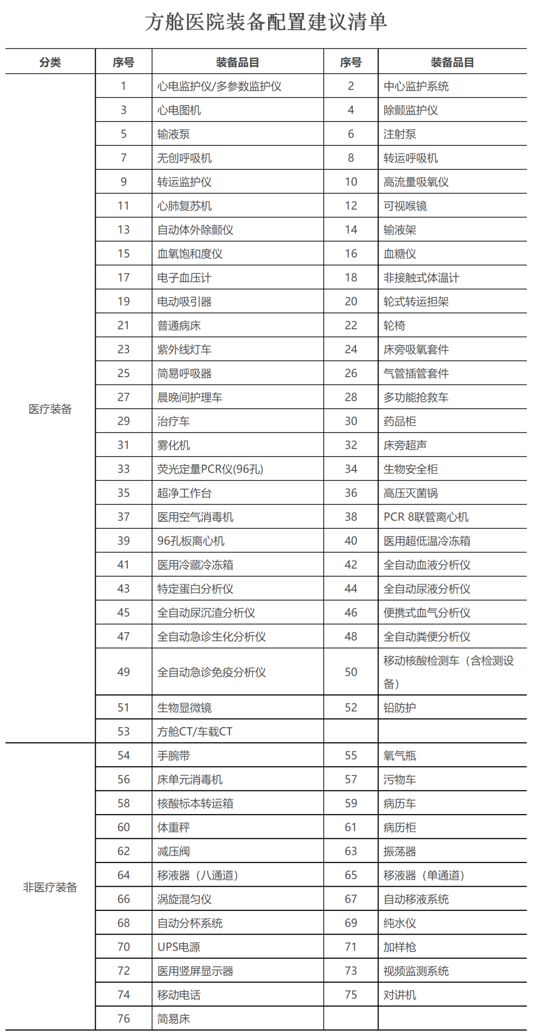 7月13日,国家卫生健康委办公厅发布《关于印发方舱医院装备配置指南(试行)的通知》,明确方舱医院装备配置建议清单(附文末)。