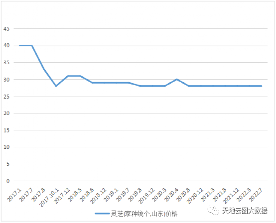2017年,山东产区的灵芝种植面积有所增加,长势良好,当年全国灵芝总产量较大,估计增产20%左右,使得产新前行情小幅下滑,随着产新的不断深入,行情进一步下滑,山东灵芝统货价格从2017年6月的40元下滑至28元左右。随后几年,灵芝行情一直在低位运行。